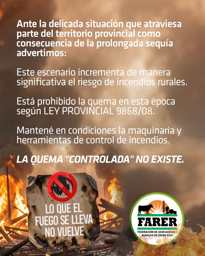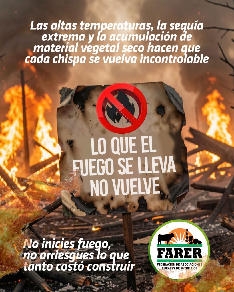 Por tal motivo, la entidad insta a extremar los cuidados y actuar con responsabilidad, entendiendo que la prevención es hoy la principal herramienta para evitar daños mayores. El compromiso individual resulta clave para proteger la producción, el ambiente y la seguridad de todos los entrerrianos.