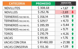 Julio logró torcer la tendencia a la baja de la hacienda en pie. Luego de dos meses de marcado retroceso, se logró una mejora en los precios con importantes incrementos en vacas con cría, terneros [...]
