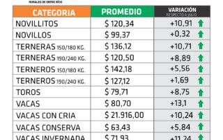 El precio de referencia de hacienda vacuna de la provincia de Entre Ríos marcó en el mes de septiembre un incremento del 5,09 % respecto del mes anterior. El informe, que contempla las principales categorías [...]