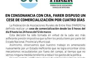 La Federación de Asociaciones Rurales de Entre Ríos (FARER) ha definido realizar un cese de comercialización desde las 0 horas del día 9 hasta las 24 horas del 12 de marzo. Esta decisión ha sido [...]
